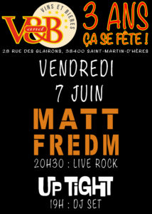 3ans du VandB Grenoble – Matt Fredm + Up Tight Matt FredM + Up Tight 07 Jun 2019 Saint-Martin-d'Hères facebookDetails Time : 19-23h Venue : VandB Grenoble Address : 8 Rue des Glairons Zip : 38400 Saint-Martin-d'Hères